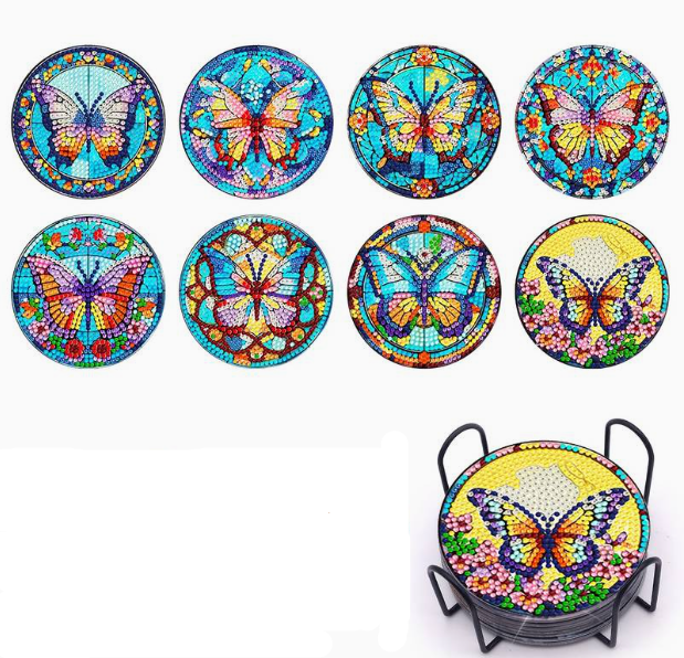 Set van 8 onderzetters met vlinders, inclusief houder.
